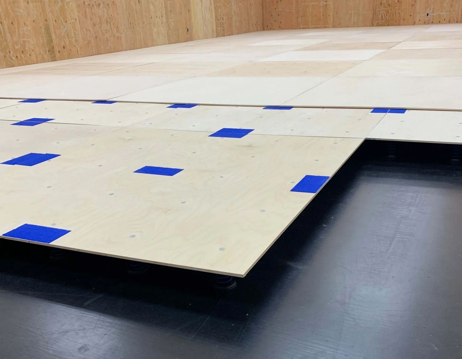 Cada módulo de 1,22 x 2,44 mts fabricado en madera contrachapada (doble capa) con resortes o súper bloques de polieter expandido que otorgan un alta absorción de impactos. Cada tablero viene con un sistema de unión mediante velcro.